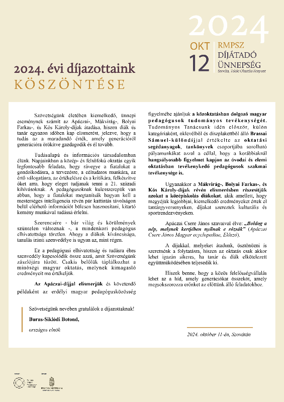 Burus-Siklódi Botond elnök üzenete a 2024. évi díjazottakhoz